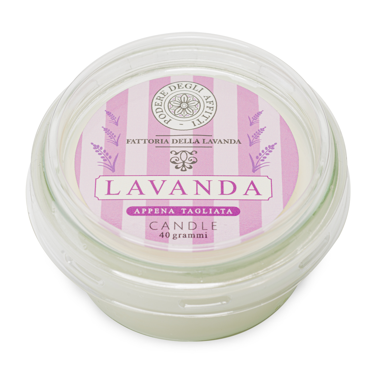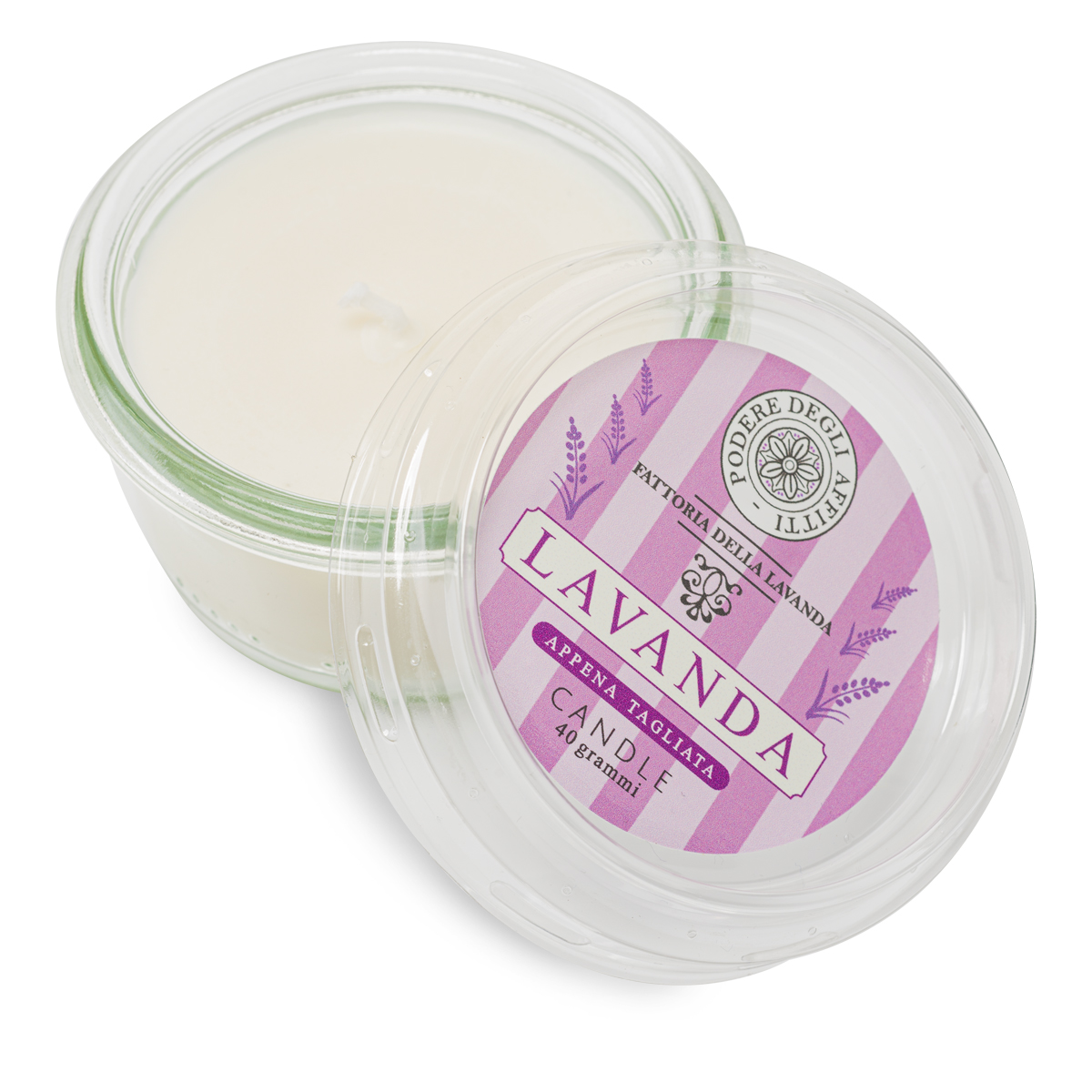 Candela alla Lavanda con cera naturale in vasetto di vetro.